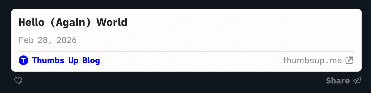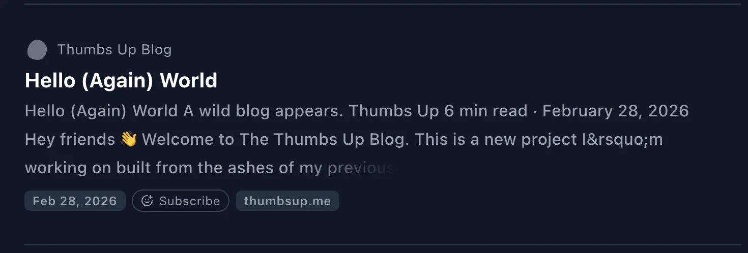 One thing that no platform does well, in my opinion, is social post embed cards. For years, Twitter was the only card you would find. Later, Mastodon became a bit more common, and more recently Bluesky. Most platforms support one, maybe two of these natively. But few support all of the ones I use. For example, almost no platform supports embedding posts from Farcaster, where I feel like some of my best posts can be found.